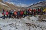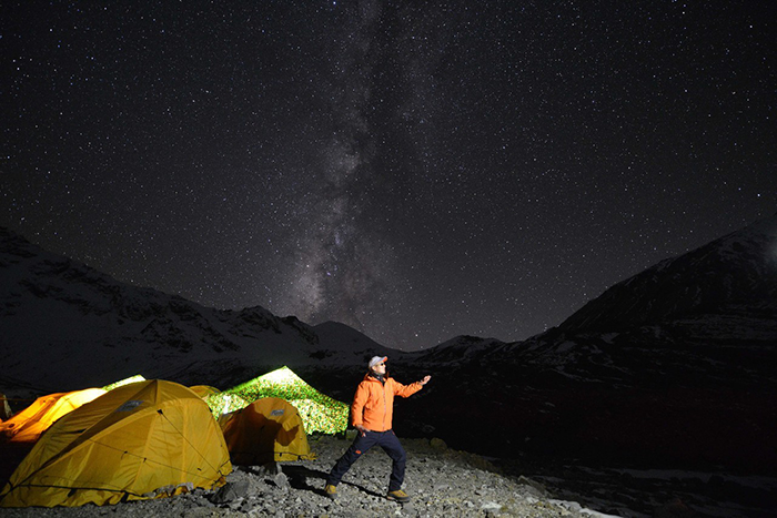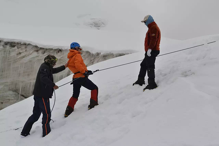 在海拔5500米處的雪線位置,教練們,選擇了一處較為平緩的雪坡,作為大本營,在這裡對隊員們進行登頂前的指導訓練。指導隊員們使用上升器與下降器,體驗穿着高山靴帶着冰爪走路的感覺,教練們在這裡認真介紹技術要領,并耐心解答隊員們提出的各種問題。休息之餘大家都躲在帳篷裡,有說有笑,完全消除了屋外雪山的寒冷。有從内地來的隊友,因高原反應,頭疼難忍,張洪就幫他們一一按摩推拿,緩解疼痛,大家就像一家人,其樂融融。