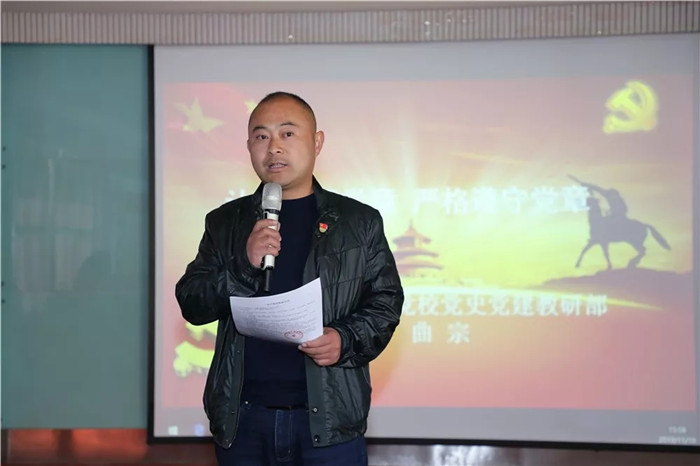 曲宗副教授首先明确了黨章 “根本大法”的地位,指出黨章是規範和指導黨的工作、黨内活動、黨的建設的根本依據。随後曲宗副教授介紹了黨章的曆史沿革,以及十九大修改黨章的曆史意義和重要内容,号召每一名黨員認真學習黨章,嚴格遵守黨章,時刻與黨中央保持一緻,自覺做到“兩個維護”。要求每一名黨員都把黨章作為政治思想建設方面的X光機,每年對照黨章給自己“體檢”一下,紅紅臉、出出汗,牢記入黨初心、遵守黨的紀律,維護一名黨員的思想行為純潔性。